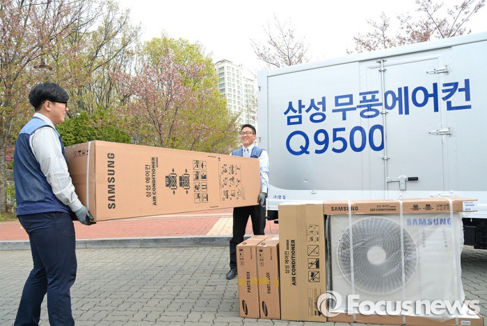 (서울=포커스뉴스) 삼성전자 에어컨 전문 설치 기사들이 경기 고양시 덕이동의 한 아파트에서 고객에게 배송 될 삼성 무풍에어컨 'Q9500'을 배송 차량에서 내리고 있다. <사진제공= 삼성전자>