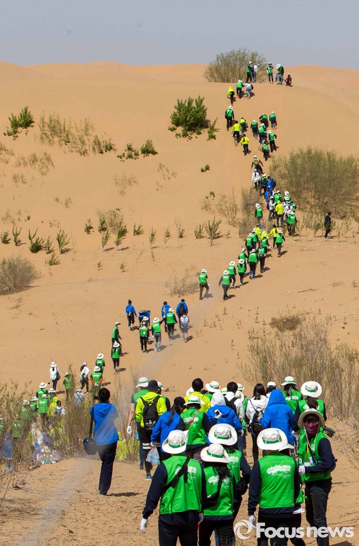 (다라더치/중국=포커스뉴스) 24일 오전 중국 내몽고 다라더치 쿠부치사막에서 한ㆍ중ㆍ일 대학생들로 구성된 2016 미래숲 15기 녹색봉사단원들이 사막트래킹을 하고 있다. 미래숲 녹색봉사단은 이번 봉사활동을 통해 황폐화된 사막에 나무 심기 및 각국 청년들과 우호를 증진을 위한 교류 활동을 전개할 예정이다.