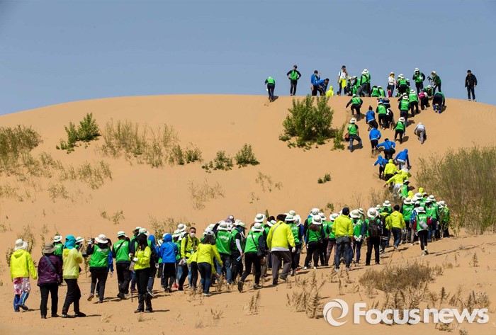 (다라더치/중국=포커스뉴스) 24일 오전 중국 내몽고 다라더치 쿠부치사막에서 한ㆍ중ㆍ일 대학생들로 구성된 2016 미래숲 15기 녹색봉사단원들이 사막트래킹을 하고 있다. 미래숲 녹색봉사단은 이번 봉사활동을 통해 황폐화된 사막에 나무 심기 및 각국 청년들과 우호를 증진을 위한 교류 활동을 전개할 예정이다.