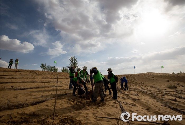 (다라더치/중국=포커스뉴스) 24일 오후 중국 내몽고 다라더치 쿠부치사막에서 2016 미래숲 15기 녹색봉사단 후원사 회원들이 나무심기작업을 하고 있다. 미래숲 녹색봉사단은 이번 봉사활동을 통해 황폐화된 사막에 나무 심기 및 각국 청년들과 우호를 증진을 위한 교류 활동을 전개할 예정이다.