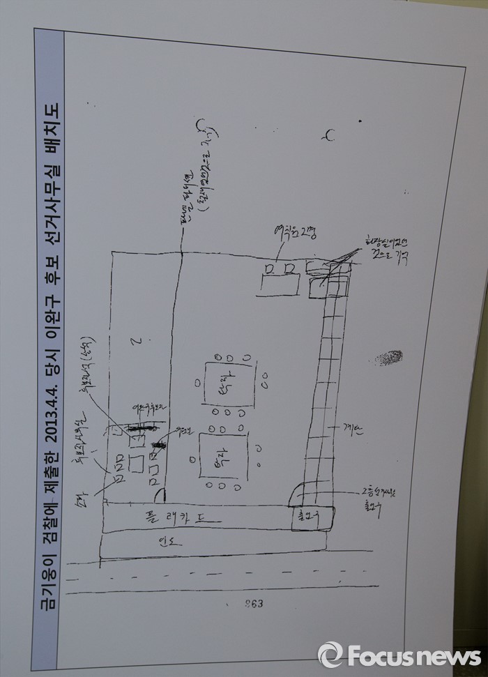 (부여=포커스뉴스) 29일 오후 이완구 전 국무총리가 2013년 재보궐 선거 때 사용한 충남 부여 선거사무소에서 서울고법 형사2부 관계자들이 현장검증을 실시한 가운데 선거사무소 배치도가 보이고 있다.