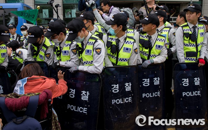 (서울=포커스뉴스) 근로자의날을 맞은 1일 오후 서울 종로구 대학로에서 민주노총 주최로 열린 '2016 세계노동절대회'에서 경찰과 420장애인차별철폐공동투쟁단원들이 충돌하고 있다.