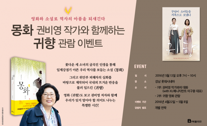 추첨을 통해 권비영 작가와의 대화 및 영화 '귀향' 관람에 함께할 수 있는 초청권을 증정한다. 이 행사는 5월13일 오후 7시 롯데시네마 강남점에서 진행된다.