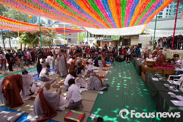 (서울=포커스뉴스) 2일 오전 서울 종로구 조계사 대웅전 앞마당에서 열린 동자승 단기출가 보리수 새싹학교 삭발, 수계식에서 동자승들이 삭발을 하고 있다.