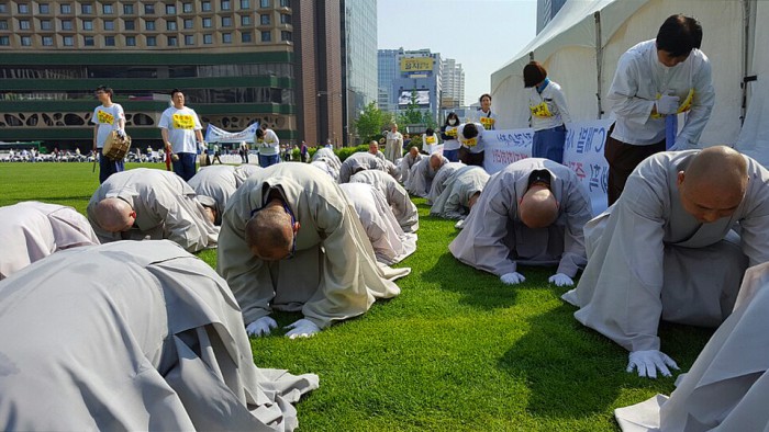 환수위는 29일 오후 승려 및 신도들 200여명과 함께 서울 종로구 조계사부터 중구 서울광장까지 약 1.5km 구간을 삼보일배하며 행진했다.