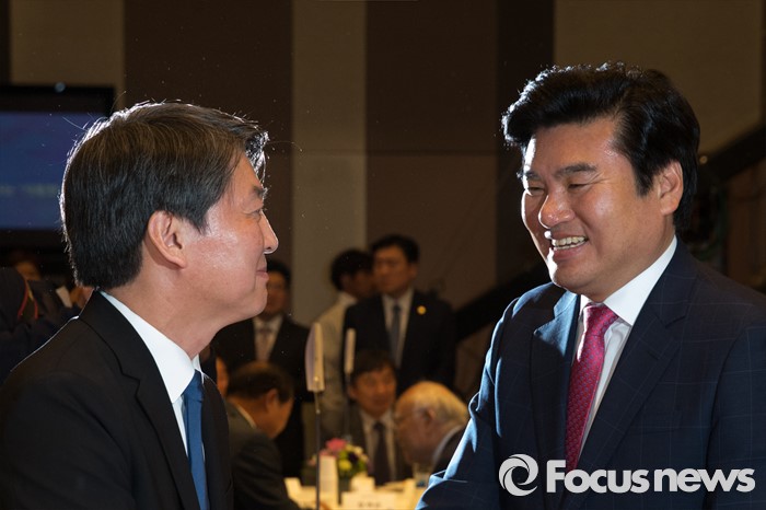 (서울=포커스뉴스) 2일 오후 서울 중구 프레스센터에서 열린 BBS 불교방송 개국 26주년 기념 비전선포식에 참석한 원유철(오른쪽) 새누리당 원내대표와 안철수 국민의당 상임공동대표가 악수하고 있다.