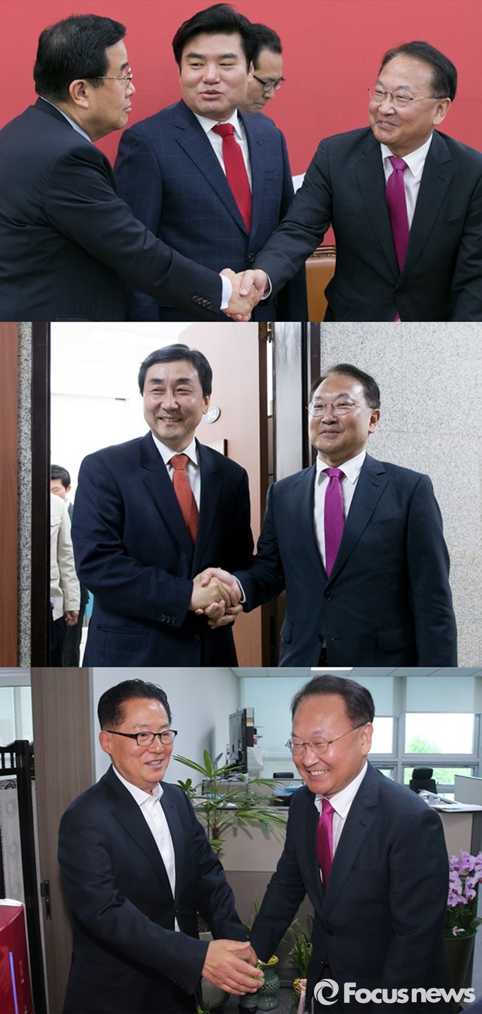 (서울=포커스뉴스) 유일호 경제부총리 겸 기획재정부 장관이 29일 서울 여의도 국회를 방문해 여야 3당 원내대표를 만나 경제활성화법안 등 의 19대 마지막 임시국회 중 처리를 요청했다. 사진 위쪽부터 아래로 원유철 새누리당 원내대표와 만난 유 부총리, 이종걸 더불어민주당 원내대표와 만난 유 부총리, 박지원 국민의당 원내대표와 만난 유 부총리.