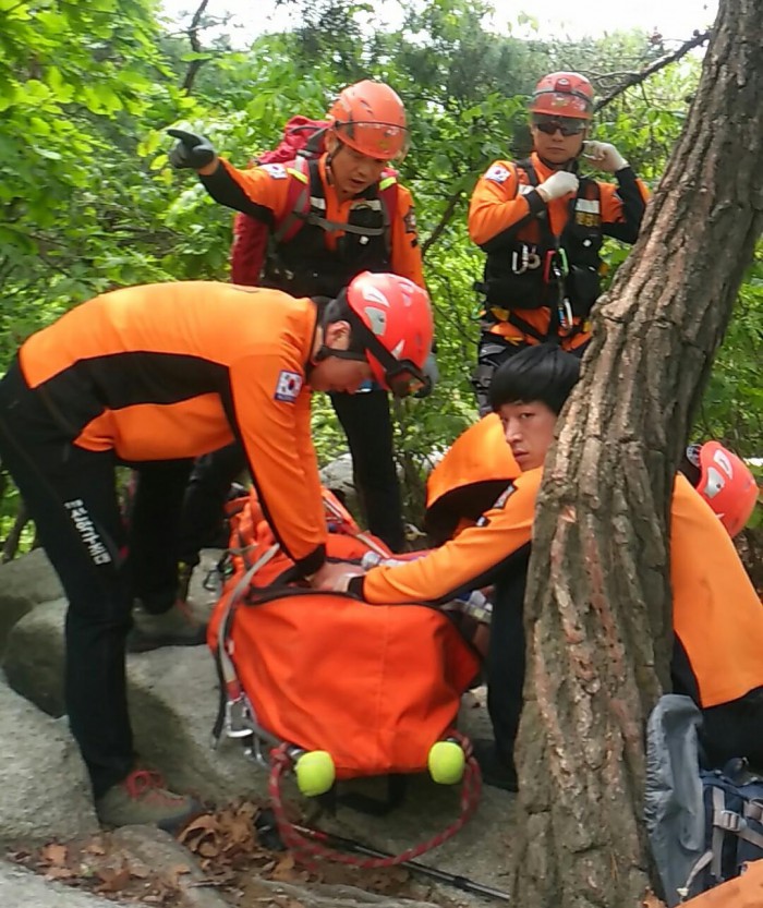 119구조대에 따르면 이씨는 등산 중 휴식을 취하다 갑자기 심장이 멎었으며 과거 뇌출혈을 앓았던 병력이 있다.1일 오전 서울 노원구 수락산에서 등산객 이모씨가 쓰러져 현장에 도착한 구조대의 응급처치를 받고 있다. <사진제공=서울시119특수구조단>