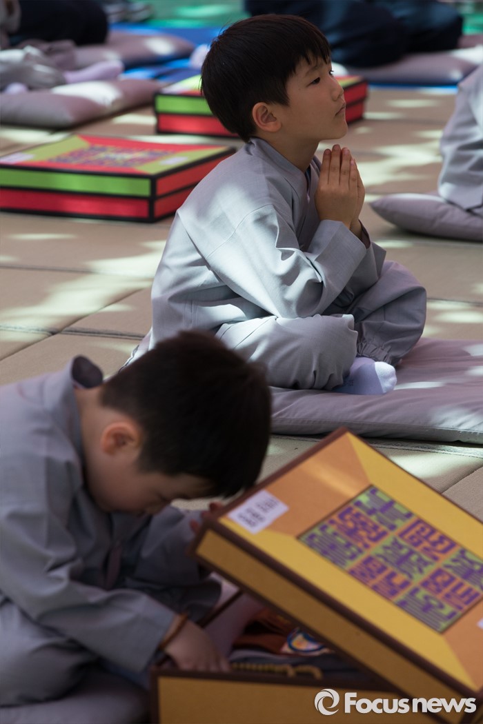 (서울=포커스뉴스) 2일 오전 서울 종로구 조계사 대웅전 앞마당에서 열린 동자승 단기출가 보리수 새싹학교 삭발, 수계식에서 동자승들이 삭발을 준비하고 있다.