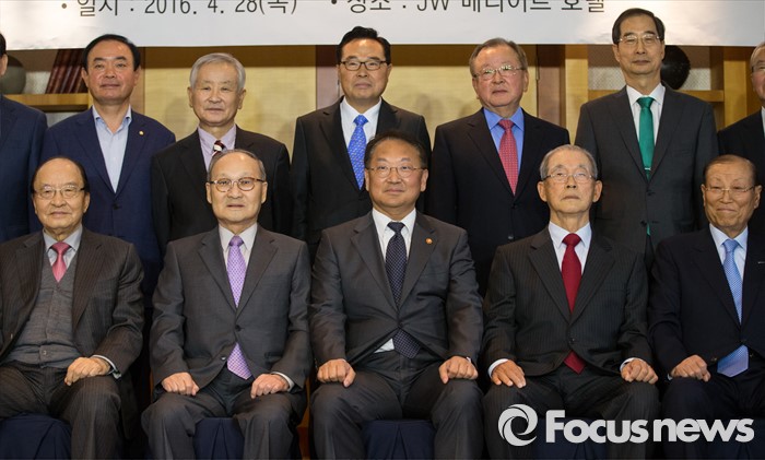 (서울=포커스뉴스) 유일호 경제부총리 겸 기획재정부 장관(앞줄 왼쪽 세번째)이 28일 오후 서울 서초구 JW매리어트호텔에서 열린 '역대 부총리·장관 초청 간담회'에서 20대 총선 새누리당 공동선대위원장을 지낸 강봉균 전 재정경재부 장관(뒷줄 왼쪽 두번째)을 비롯한 참석자들과 기념촬영을 하고 있다.
