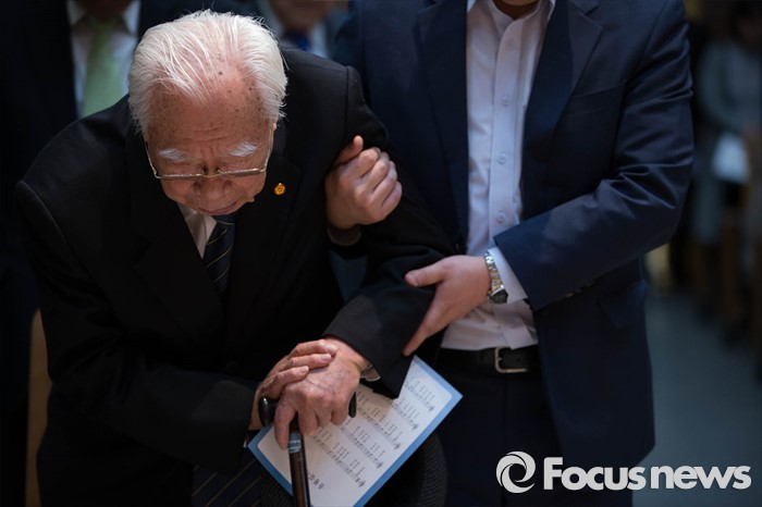 (서울=포커스뉴스) 윤봉길 의사의 상하이 의거 84주년을 맞아 29일 오전 서울 서초구 매헌기념관에서 열린 기념식에 참석한 김우전(왼쪽) 원로애국지사가 부축을 받으며 묵념하고 있다.