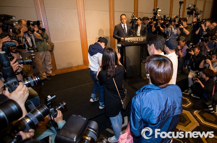 (서울=포커스뉴스) 2일 오전 서울 영등포구 콘래드호텔에서 열린 '옥시레킷벤키저(현 RB코리아) 가습기 살균제 파동' 관련 기자회견에서 아타 울라시드 사프달 옥시코리아 대표가 피해자 가족들에게 항의 받고 있다.