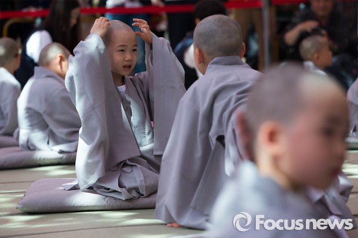 (서울=포커스뉴스) 2일 오전 서울 종로구 조계사 대웅전 앞마당에서 열린 동자승 단기출가 보리수 새싹학교 삭발, 수계식에서 동자승들이 삭발을 마친 뒤 머리를 만져보고 있다.