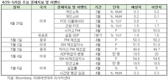 오는 2일(현지시간)에는 미국의 4월 ISM제조업 지수가 발표된 예정이다. 현재 시장 전망치는 51.5로 전월 51.8 대비 둔화될 것으로 전망된다.