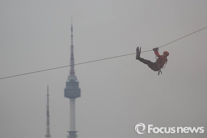 (서울=포커스뉴스) 27일 오전 서울 영등포구 여의도 한강공원 원효대교 일대에서 열린 '수도 서울 민․관․군 합동 대규모 복합재난 가상훈련'에 참가한 구조대원들이 레펠하강을 하고 있다.
