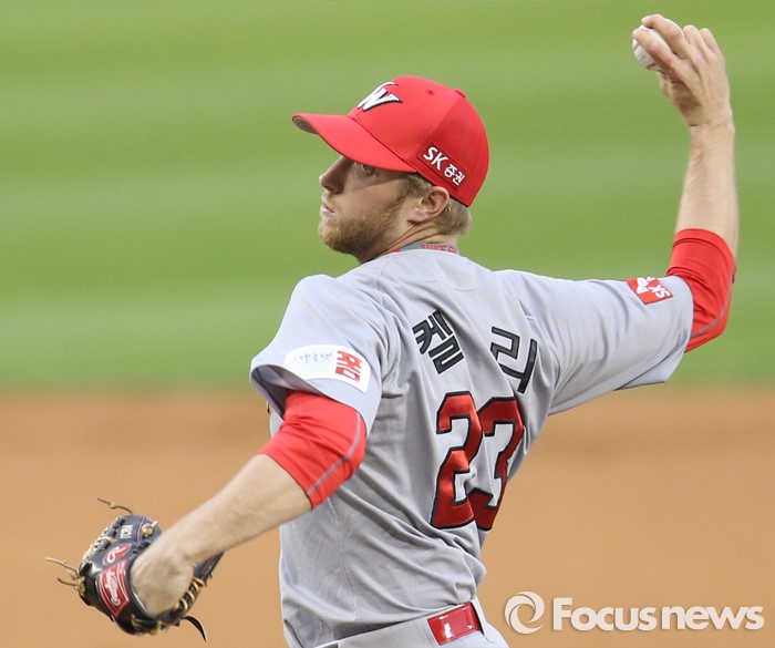 (서울=포커스뉴스) 26일 서울 잠실구장에서 열린 2016 프로야구 SK-두산 경기에서 1회말 SK 선발투수 켈리가 투구하고 있다.