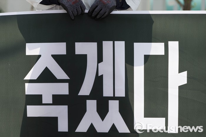 (서울=포커스뉴스) 29일 오후 서울 종로구 정부서울청사 앞에서 상경한 현대중공업노조원들이 구조조정 중단 및 산업현장 안정을 촉구하며 기자회견을 하고 있다.