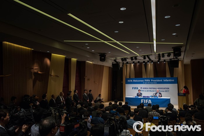 (서울=포커스뉴스) 27일 오후 서울 강남구 아이파크타워에서 지아니 인판티노 FIFA 감독과 정몽규 대한축구협회장이 참석한 기자회견이 열리고 있다.