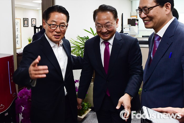 (서울=포커스뉴스) 박지원(왼쪽) 국민의당 원내대표가 29일 오전 서울 여의도 국회 의원회관에서 경제활성화법안 등 처리 요청을 위해 방문한 유일호 경제부총리 겸 기획재정부 장관과 면담을 위해 이동하고 있다.