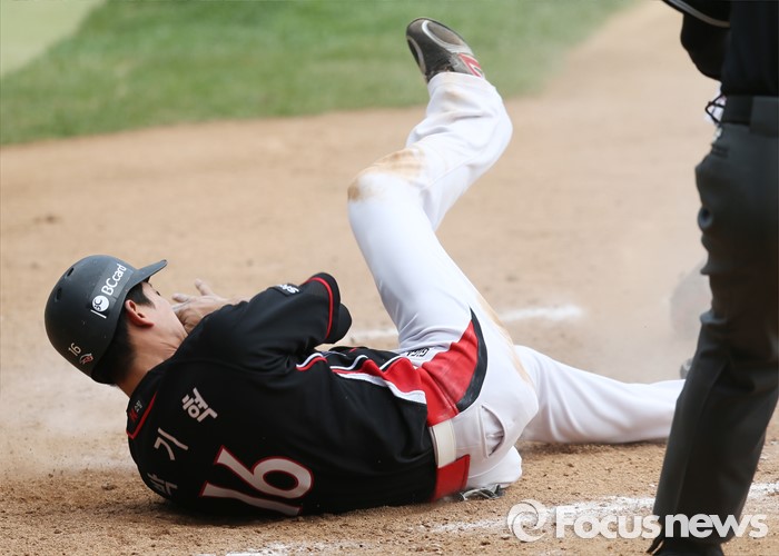 (서울=포커스뉴스) 1일 서울 잠실구장에서 열린 2016 프로야구 kt-LG 경기 4회초 1사 1,2루에서 kt 대타 전민수의 중전안타때 2루줒바 박기혁이 홈까지 뛰어들다 안웃되고 있다.