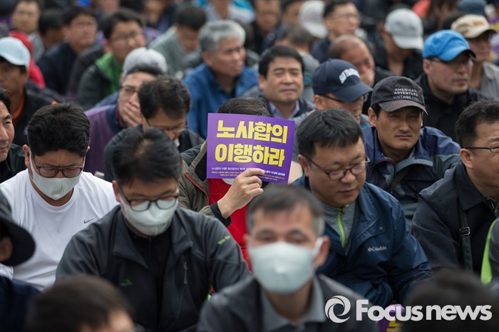 (서울=포커스뉴스) 30일 오후 서울역 광장에서 민주노총 공공운수 전국철도노동조합 회원들이 '철도노동자 1차 총력 결의대회'를 하고 있다.