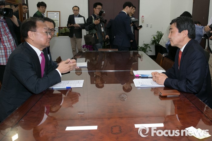 (서울=포커스뉴스) 이종걸(오른쪽) 더불어민주당 원내대표가 29일 오전 서울 여의도 국회에서 경제활성화법안 등 처리 요청을 위해 방문한 유일호 경제부총리 겸 기획재정부 장관과 면담하고 있다.