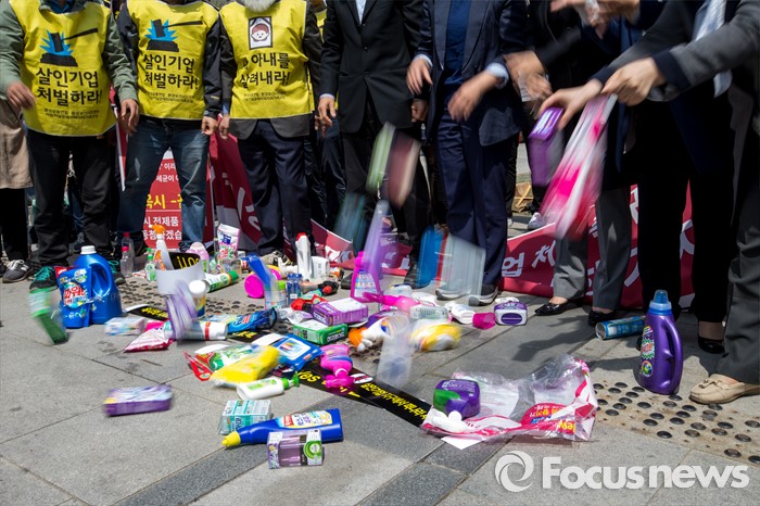 (서울=포커스뉴스) 25일 오전 서울 종로구 광화문 광장에서 옥시 가습기 살균제 피해 가족 및 환경단체 관계자들이 옥시 상품 불매를 촉구하는 퍼포먼스를 펼치고 있다.