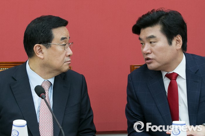 (서울=포커스뉴스) 원유철(오른쪽) 새누리당 대표최고위원 권한대행과 김정훈 정책위의장이 29일 오전 서울 여의도 국회에서 열린 원내대책회의에 참석해, 대화하고 있다.