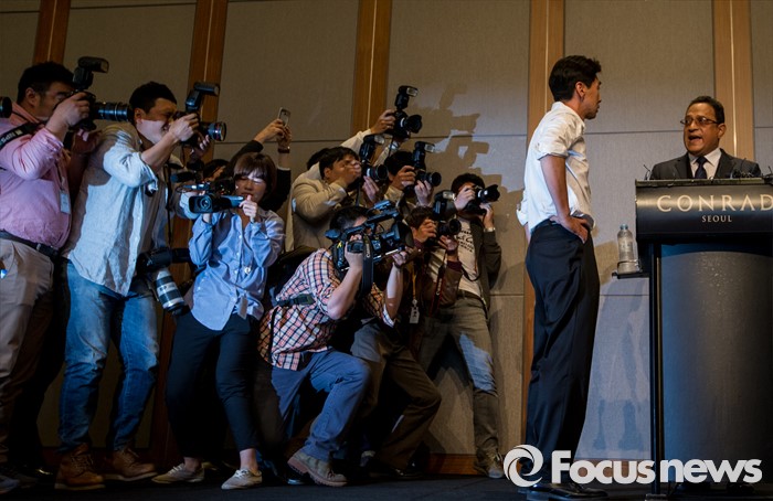 (서울=포커스뉴스) 2일 오전 서울 영등포구 콘래드호텔에서 열린 '옥시레킷벤키저(현 RB코리아) 가습기 살균제 파동' 관련 기자회견에서 아타 울라시드 사프달 옥시코리아 대표가 피해자 가족들에게 항의 받고 있다.