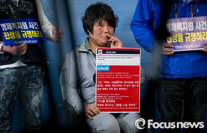 (서울=포커스뉴스) 27일 오전 서울 여의도 국회 정론관에서 진선미 더불어민주당 의원과 형제복지원 사건 피해생존자, 실종자, 유가족모임 등 관련단체 주최로 열린 형제복지원 특별법 제정 촉구 기자회견에 참석한 피해 생존자 박순이 씨가 슬픔에 잠겨 있다.