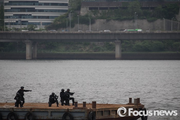 (서울=포커스뉴스) 27일 오전 서울 영등포구 여의도 한강공원 원효대교 일대에서 열린 '수도 서울 민․관․군 합동 대규모 복합재난 가상훈련'에 참가한 경찰특공대가 경계를 서고 있다.