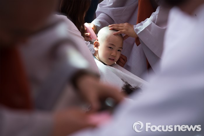 (서울=포커스뉴스) 2일 오전 서울 종로구 조계사 대웅전 앞마당에서 열린 동자승 단기출가 보리수 새싹학교 삭발, 수계식에서 동자승들이 삭발을 하고 있다.