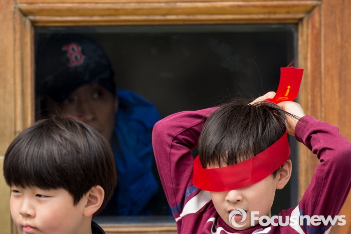 (서울=포커스뉴스) 근로자의날을 맞은 1일 오후 서울광장에서 열린 한국노총 5.1 전국노동자대회에 참가한 어린이기 머리띠를 가지고 놀고 있다.