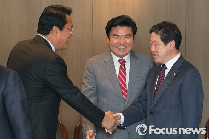 (서울=포커스뉴스) 원유철(가운데) 새누리당 원내대표가 25일 오후 서울 여의도의 한 중식당에서 열린 중진의원 오찬 간담회에 참석해, 유기준(오른쪽) 의원과 정진석 당선인이 악수하는 모습을 보고 있다.