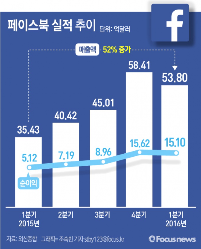 (서울=포커스뉴스) 페이스북의 분기 매출이 50% 넘게 증가해 월스트리트의 당초 예상을 크게 넘어섰다. 분석가들은 페이스북이 이처럼 좋은 실적을 올린 것은 페이스북의 인기 높은 모바일 앱과 생방송 동영상 진출이 새 광고주들을 끌어 들인데다 기존 광고주들이 지출을 늘리도록 촉진했기 때문으로 분석하고 있다.
