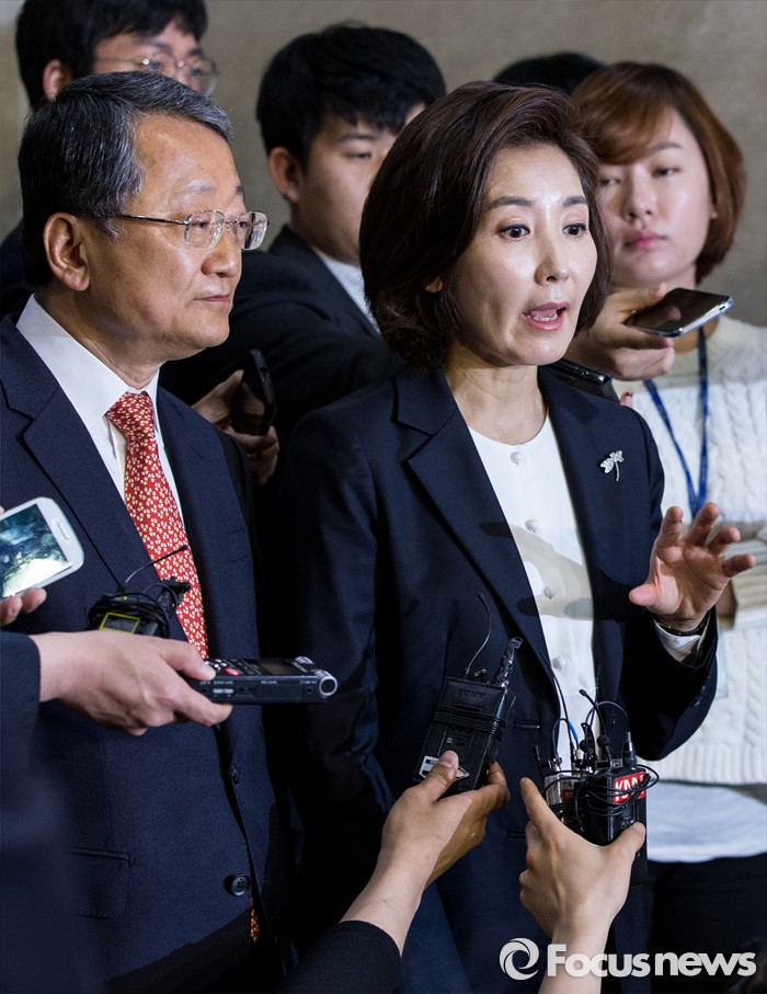 (서울=포커스뉴스) 새누리당 차기 원내대표 경선 후보등록 마감 예정일인 1일 오전 서울 여의도 국회 정론관에서 차기 원내대표 후보인 나경원 의원과 정책위의장 후보 김재경 의원이 출마 기자회견을 갖고 있다.