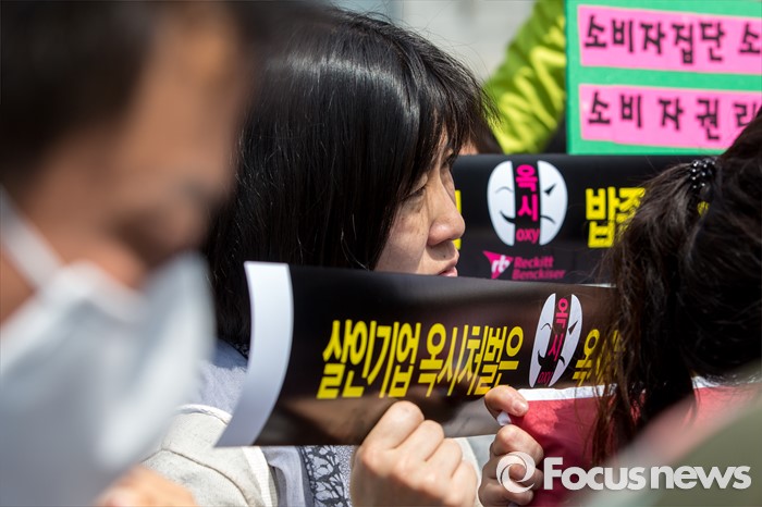(서울=포커스뉴스) 25일 오전 서울 종로구 광화문 광장에서 옥시 가습기 살균제 피해 가족 및 환경단체 관계자들이 옥시 상품 불매를 촉구하는 기자회견을 하고 있다.
