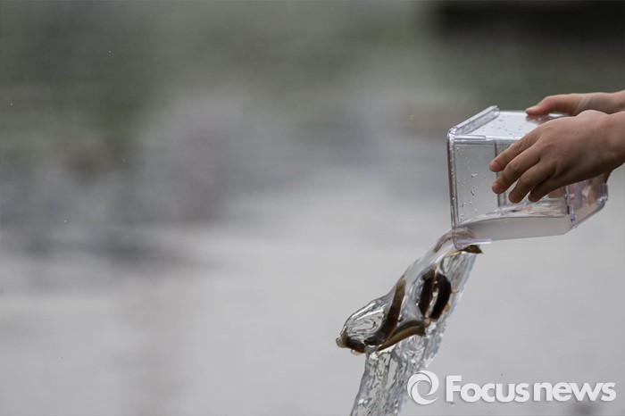 (서울=포커스뉴스) 27일 오전 서울 영등포구 여의도 샛강생태공원에서 어린이들이 모기 퇴치를 위해 미꾸라지를 방류하고 있다.