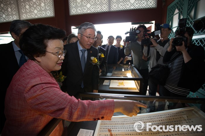(서울=포커스뉴스) 27일 오후 서울 종로구 경복궁 집옥재에서 열린 궁궐 속 작은도서관 집옥재 개관행사를 마친 뒤 김종덕(왼쪽 두번째) 문화체육관광부 장관과 이배용 한국학중앙연구원 원장이 내부를 둘러보고 있다.