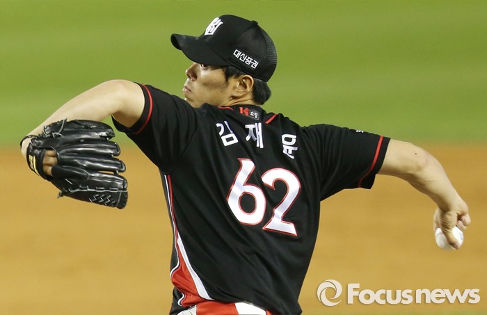 (서울=포커스뉴스) 29일 서울 잠실구장에서 열린 2016 프로야구 kt-LG 경기에서 kt 투수 김재윤이 8회말에 투구하고 있다.
