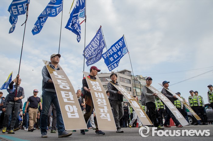 (서울=포커스뉴스) 근로자의날을 맞은 1일 오후 서울 종로구 대학로에서 민주노총 주최로 열린 '2016 세계노동절대회'를 마친 참가자들이 종로로 행진을 이어가고 있다.