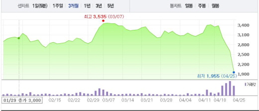 자율협약은 워크아웃(기업개선작업)이나 법정관리(기업회생절차)보다 강도가 낮은 구조조정 수단이다. 자율협약에 들어가면 자산 매각, 감자 등 채권단 주도의 구조조정이 이뤄질 것으로 보인다.주가흐름<사진출처=네이버 캡쳐>
