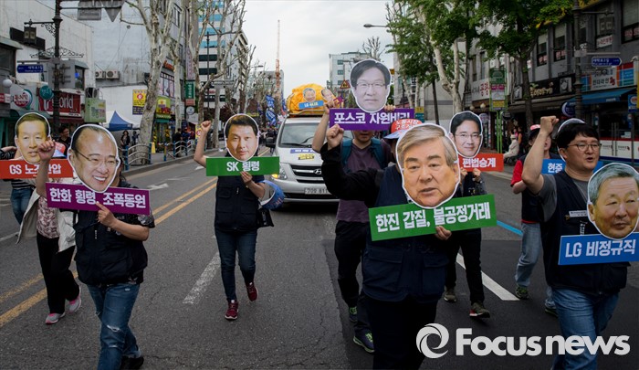 (서울=포커스뉴스) 근로자의날을 맞은 1일 오후 서울 종로구 대학로에서 민주노총 주최로 열린 '2016 세계노동절대회'를 마친 참가자들이 종로로 행진을 이어가고 있다.