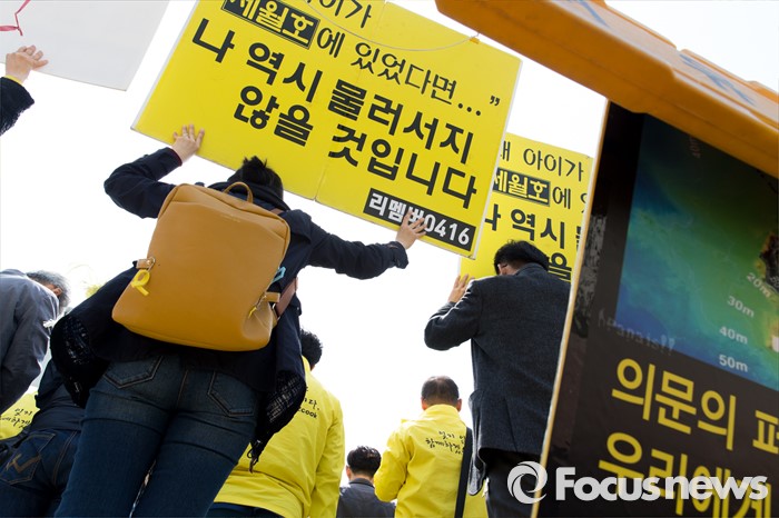 (서울=포커스뉴스) 25일 오전 서울 여의도 국회의사당 정문 앞에서 4월 16일의 약속국민연대 관계자들이 세월호 진상규명 특별법 개정 및 특검 실시 촉구 기자회견을 하고 있다.