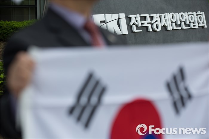 (서울=포커스뉴스) 26일 오후 서울 영등포구 전경련회관 앞에서 애국국민운동대연합 회원들이 어버이연합 억대 금품지원 규탄 기자회견을 하고 있다.