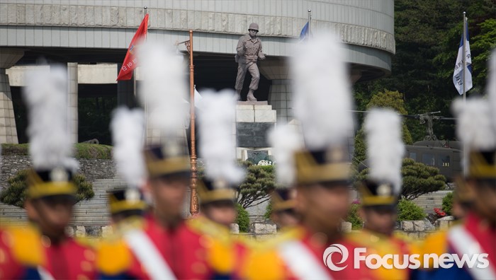 (서울=포커스뉴스) 29일 오후 서울 노원구 육군사관학교에서 열린 개교 70주년 기념식에서 생도들이 도열하고 있다.