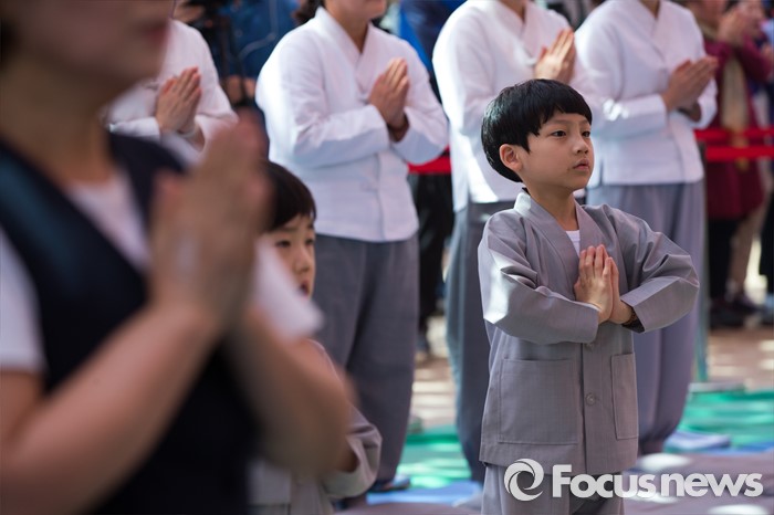 (서울=포커스뉴스) 2일 오전 서울 종로구 조계사 대웅전 앞마당에서 열린 동자승 단기출가 보리수 새싹학교 삭발, 수계식에서 동자승들이 합장을 하고 있다.