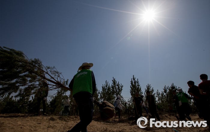 (다라더치/중국=포커스뉴스) 25일 오전 중국 내몽고 다라더치 쿠부치사막에서 2016 미래숲 15기 녹색봉사단원들이 나무 심기 작업을 하고 있다. 미래숲 녹색봉사단은 이번 봉사활동을 통해 황폐화된 사막에 나무 심기 및 각국 청년들과 우호를 증진을 위한 교류 활동을 전개했다.