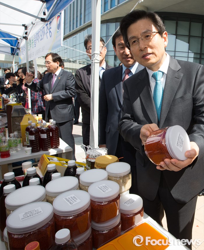 (세종=포커스뉴스) 황교안 국무총리가 26일 오전 세종시 정부세종청사 국토교통부 내 광장에서 열린 국무총리실과 1사 1촌 자매결연을 맺은 충주 재오개마을 농·특산물 직거래 장터에 방문해 농산물과 특산물을 살피고 있다.