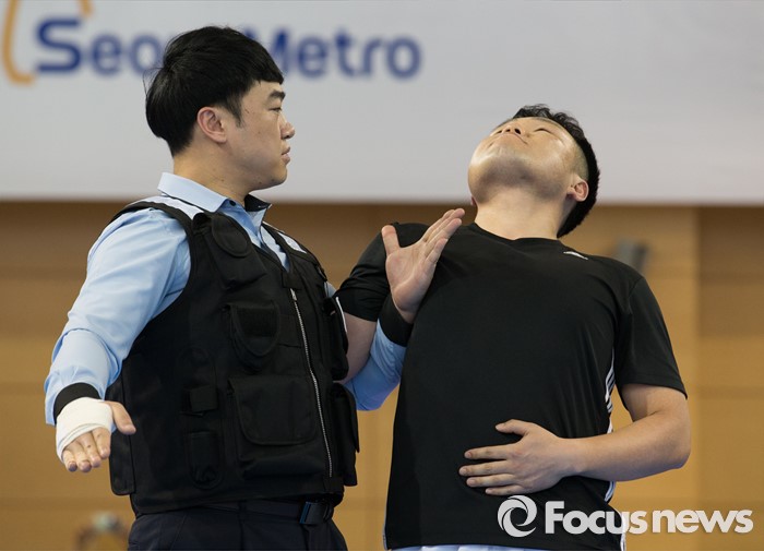 | △ 제압 시범 보이는 지하철보안관 |